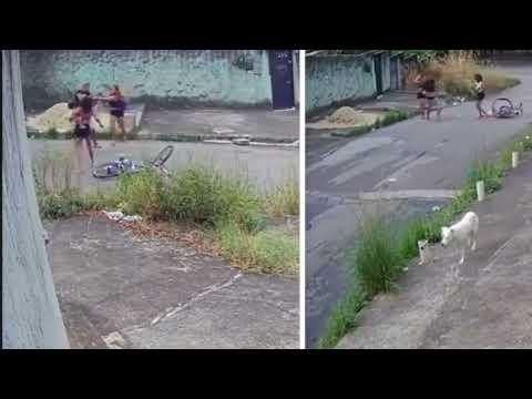 Elas entram em luta corporal com Leonardo e em certo momento a criança quase cai do colo da mulher. Em seguida, uma delas pisa no pneu da bicicleta do rapaz, que foge em seguida.